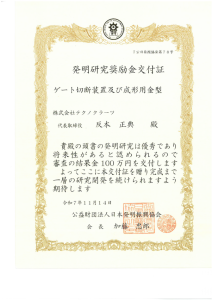 本奨励金は、保有特許が社会実装されるまでの間に為される試作・実験に必要な資金の支援を目的とするものです。 全国から140件余の特許事案の応募があり、1次、2次審査で7件に絞られ、最終審査で我社の特許事案を含めて3件が 交付対象特許事案となった次第です。 弊社の当該特許事案は、従来にない特殊な構造を有しており、金型内でゲート部分を、型開き力を利用し、自動的にカット します。しかも、この新型”すっぽん”では、切断の際に発生する樹脂切断カスが発生しないことが確認できています。 また、従来の金型と比べ、従来の2倍の数の成形品を成形する程の金型の省スペースを実現し、金型サイズの小型化に貢献します。 更に、このことに拠り、 ・廃棄するランナーの長さが1/3以下になる。 ・切断治具、ロボット、人に拠る切断労務が、全て不要です。 ・上記の工程が無くなるため、全体の成形サイクル上、成形機のみで完全成形品が金型から取り出せるため、生産時間効率が 飛躍的に上がります。 現在、先行試験にて、この新型”すっぽん”を実際の金型に設置した連続成形で、良好な切断を実現しています。 今後、当該”すっぽん”の量産に向けての、耐摩耗・強度等の品質を備えた「金型内ゲートカット”すっぽん”」の量産機種として、 全国販売を目指します。